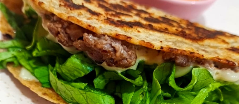 5. Monte: espalhe metade do cheddar/requeijão sobre metade do Rap10, adicione a carne e a cebola, cubra com o restante do cheddar e dobre o Rap10. Tampe por 1–2 minutos até o queijo derreter. 🧀